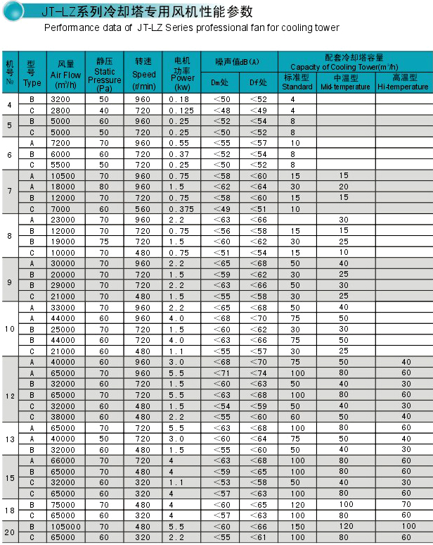 | JT-LZ、LTF系列冷却塔专用风机是本公司与上海交通大学经过二十多年的联合研制、开发并大批量生产的产品,进行过四次更新换代,使产品更加精益求精,曾分别多次获得浙江省、上海市环保部门重大(优秀)科技成果奖和科技进步奖、国家质量奖等,其中宽叶、大弦长、空间扭曲型设计还荣获国家发明奖。该产品具有效率高、噪声低、耗电省、运行可靠等特点,现已广泛应用于各冷却塔制造商的方形横流式冷却塔、方形(圆形)逆流式冷却塔,其派生型还应用于蒸发式冷凝器、风冷、油冷等装置。 JT-LZ、LTF系列冷却塔专用风机可根据用户不同使用场合的要求分别采用铝合金、玻璃钢材质生产,直径小于1500mm的风机亦可采用ABS或PLOYCARBONATE材质。 |