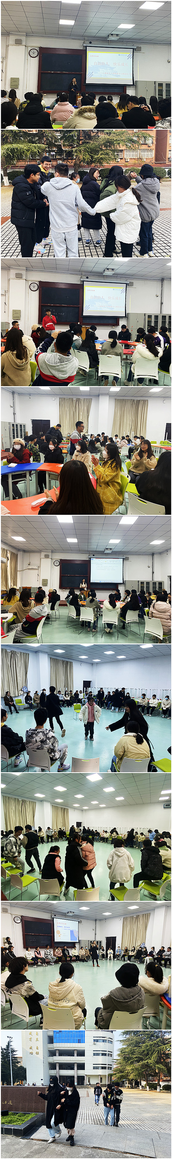 此次培训分五次进行,第一次课以“自助助人 快乐成长”为主题,进行理论教学。李老师对心理委员的工作内容进行了详细的阐述,并对心理健康教育基础知识进行初步普及,对常见心理问题如何识别与诊断,对大学生恋爱问题如何进行心理调适等进行分析讨论。第二次至第五次是团体辅导。以“我的情绪我做主”和“人际沟通训练”为主题,带领心理委员们从自身出发,学会悦纳自己,自助后助人,并通过“滚雪球”“大风吹”“心有千千结”“桃花开”“盲人与拐杖”等活动,开展小组讨论,让同学们找问题,谈感受,找解决办法,体会到情绪管理的重要性和人际关系的重要性,为他们今后的助人工作起到示范与指导作用。