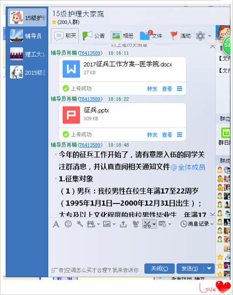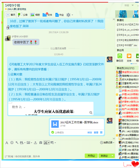 我院成立征兵工作小组,由学工办李金丽老师负责征兵的各项具体工作。会后,我院辅导员按照时书记要求,在全体学生中召开了“2017年征兵政策宣传大会”,及时传达相关信息,对于实习在外的学生,通过QQ、微信等方式通知传达,确保将今年学校征兵工作的有关精神传达给每一名学生。班会中,辅导员们为学生详细介绍大学生应征入伍的各种政策,及时解答同学们提出的问题,强调大学生应征入伍是提升自我精神文化和个人能力的重要途径,积极鼓励青年学子携笔从戎。