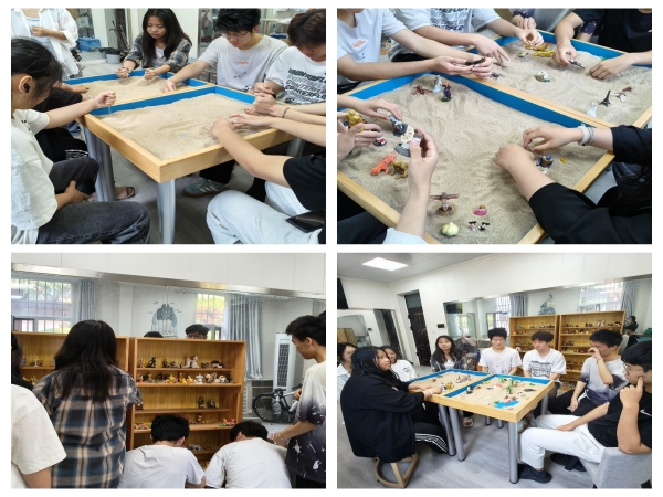 活动精心设计了三个沉浸式环节。“触沙体验”环节中,同学们将双手轻轻埋入细腻的沙粒,通过触觉的安抚放松身心,悄然卸下心防与压力。随后的“挑选好物”环节,参与者从琳琅满目的沙具架上,分别慎重挑选出两件“心仪之物”与两件“抗拒之物”,并在展示分享中讲述选择背后的故事与情感,于无声处实现了心灵的交流与共鸣。在“共创沙盘”环节,小组成员围绕各自挑选的沙具展开热烈讨论,共同构思布局。随着创作的深入,风格各异的元素在沙盘中奇妙融合,共同编织出一个属于团队的独特叙事。最后的“故事分享”环节,各组代表结合沙盘意象生动诠释作品内涵,既展现了成员个性化的内心世界,也体现了团队智慧与共识的凝聚过程。